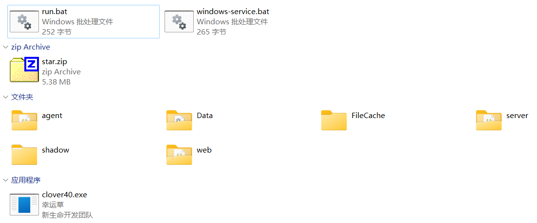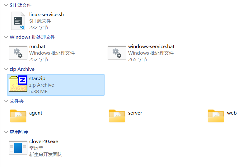 安装包内包括server目录(对应StarServer)、web目录(对应StarWeb)、agent目录(对应StarAgent),且agent目录内StarAgent.config配置文件已经配置好守护StarServer和StarWeb的应用服务。另外还有几个Windows安装脚本和Linux安装脚本。