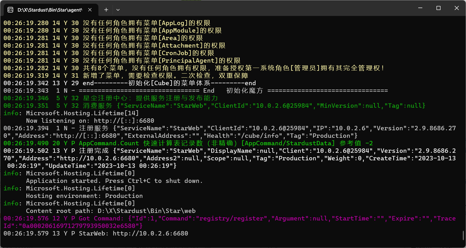 双击“run.bat”,脚本将检测并安装net7.0-aspnet,接着启动星尘代理StarAgent。