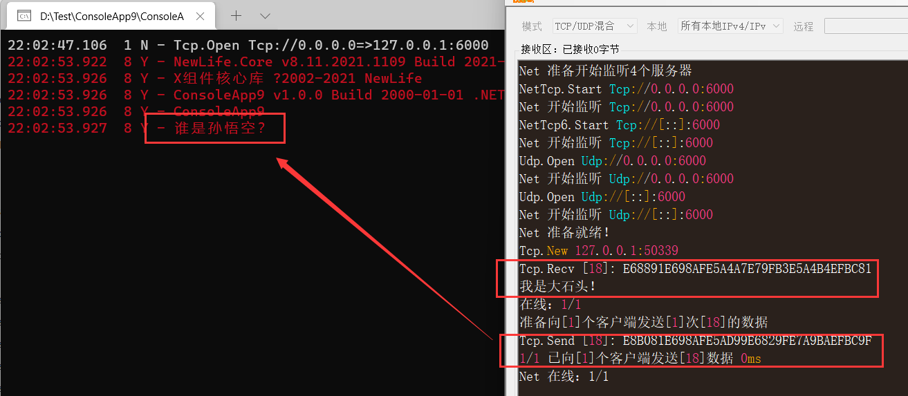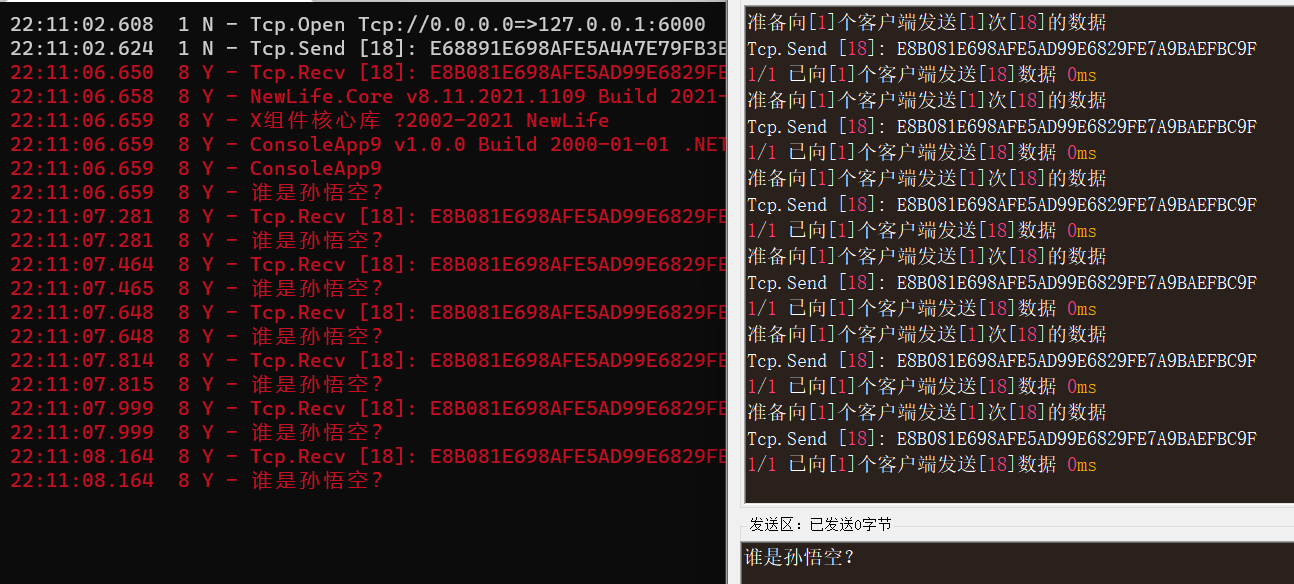 码神工具下方发送窗口输入“谁是孙悟空?”,点击“发送”,控制台中收到了数据,并显示出来。