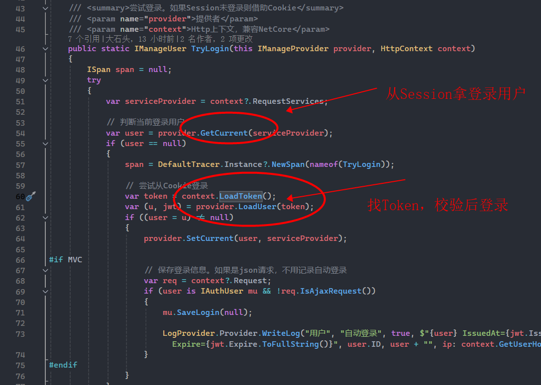 该静态属性内部会做很多事情,主要是从Session获取登录用户,若没有则找Token然后验证得到用户。感兴趣的同学可以看 ManagerProviderHelper.TryLogin ,里面的LoadToken/LoadUser是重点。
