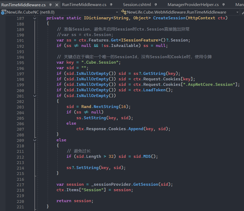 关键就在于上面说的自定义Session之中。如果不允许在Cookie中写Token,也禁用了Session,那么魔方会创建一个随机字符串作为SessionId,结合内存缓存得到自定义Session这个内存字典。再把这个SessionId写入浏览器Cookie,名称是.Cube.Session。