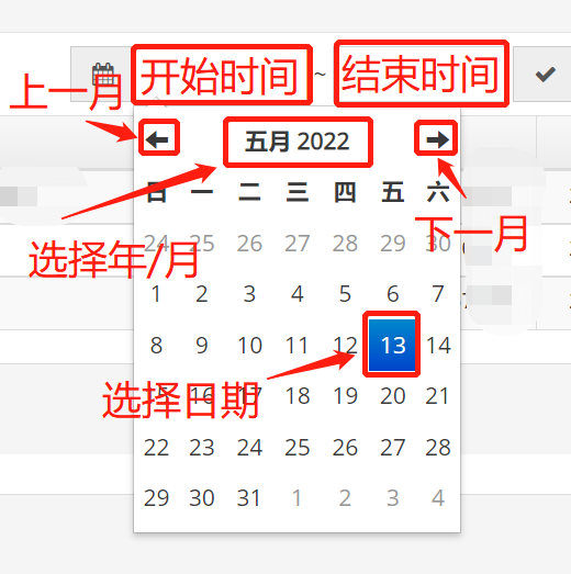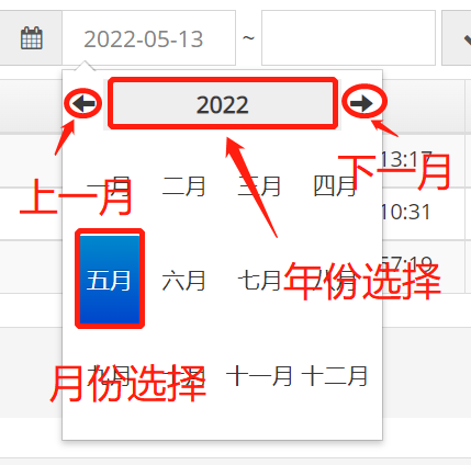 - 点击时间输入框体打开日期选择控件(图15),默认是按照天的最小维度选择。点击(五月2022位置)打开(图16)年月选择界面选择年月,选择月份返回(图15)选择日期。