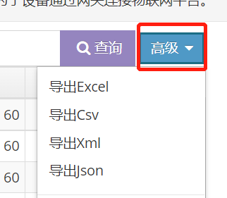 列表页 - 高级 - 选择需要导出的数据类型(图19),默认支持Excel、Csv、Xml、Json类型数据。