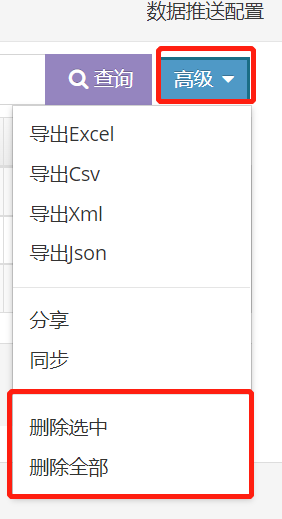 首先在列表页面中勾选需要删除的数据(图21),点击高级 - 删除选中 功能,可以执行批量删除。