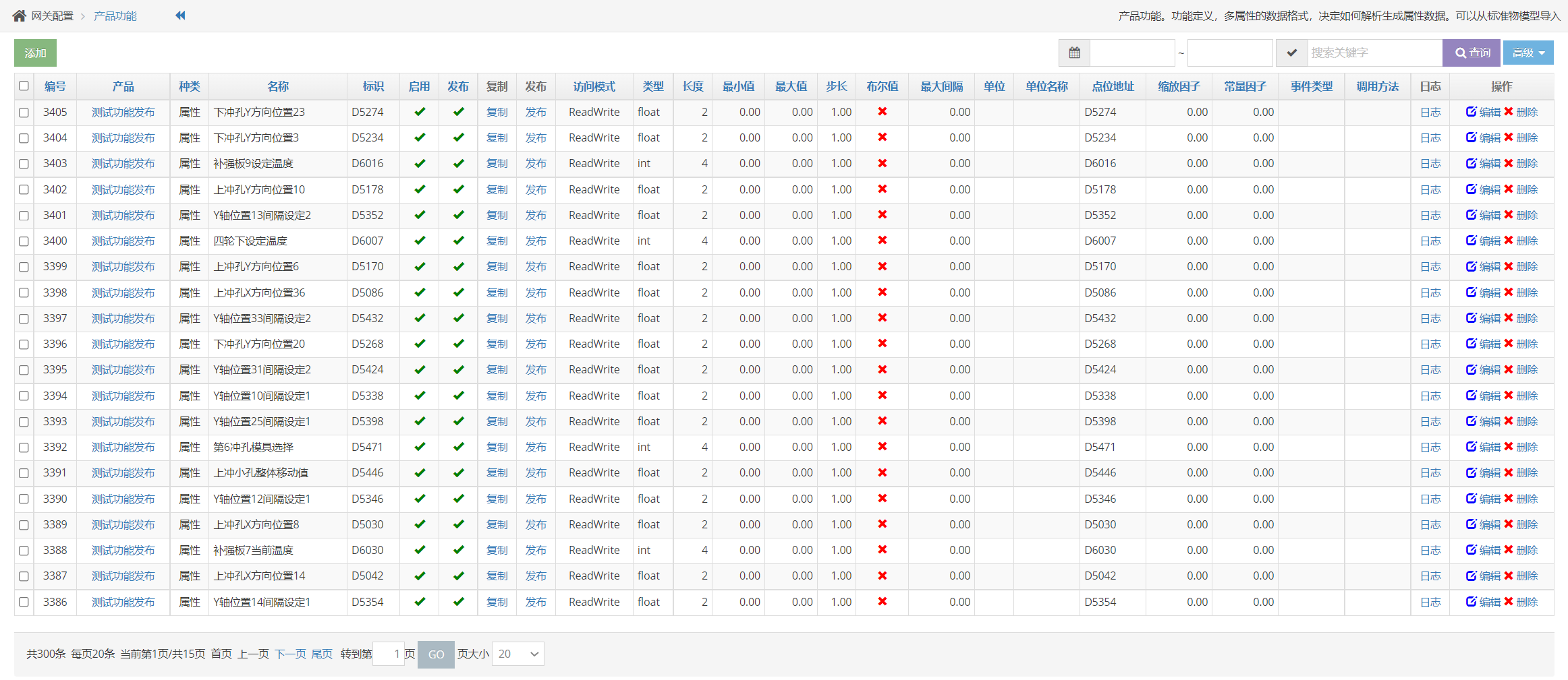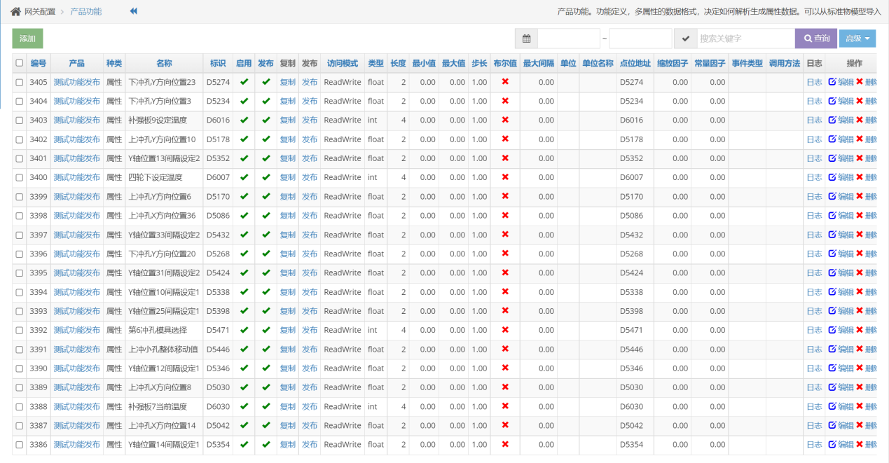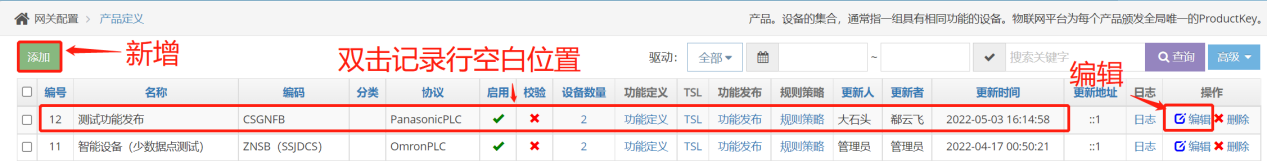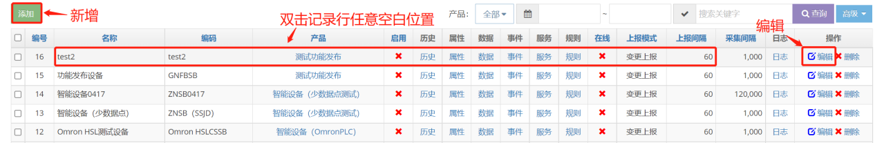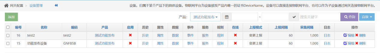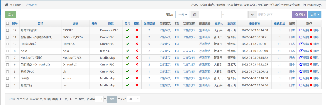 点击 网关配置 - 产品定义菜单(图34),进入产品定义列表页面(图35)。