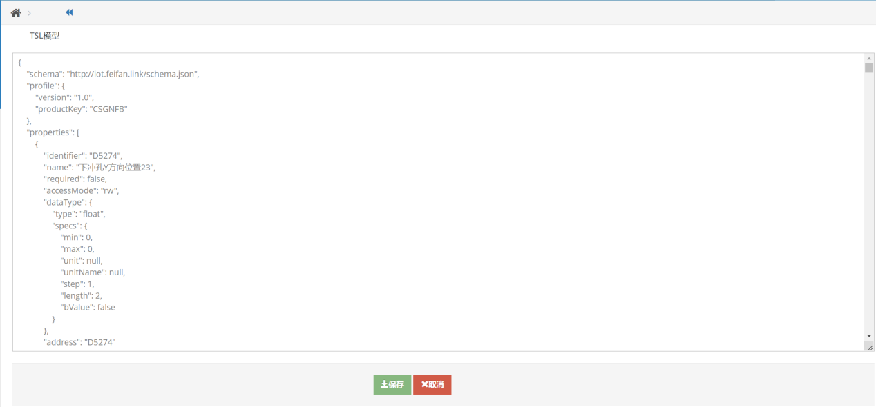 点击 网关配置 - 产品定义菜单(图22),进入产品定义列表页面(图23),点击物模型(图28-1)点击新增或编辑按钮进入物模型编辑页面(图28-2)。
