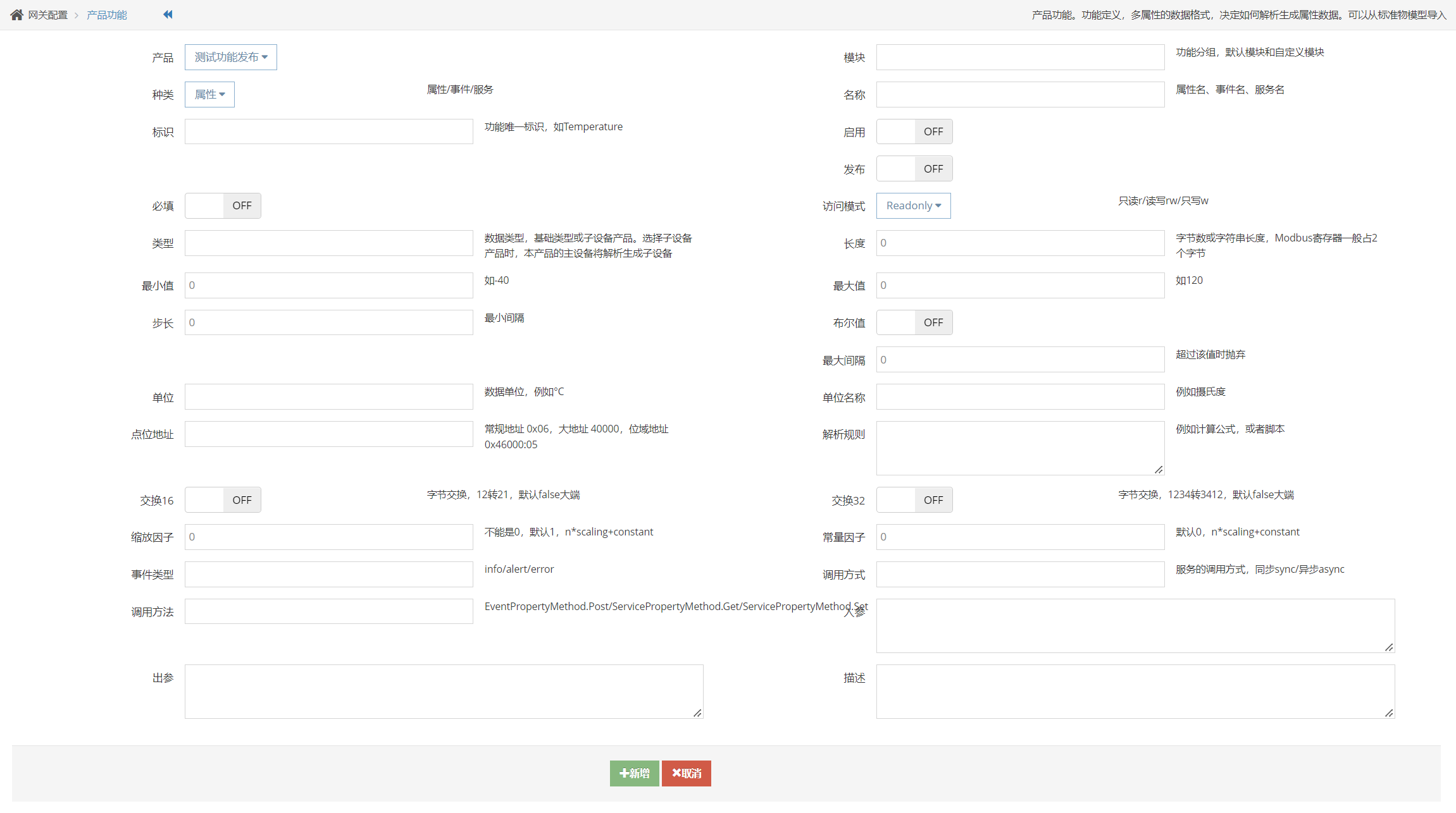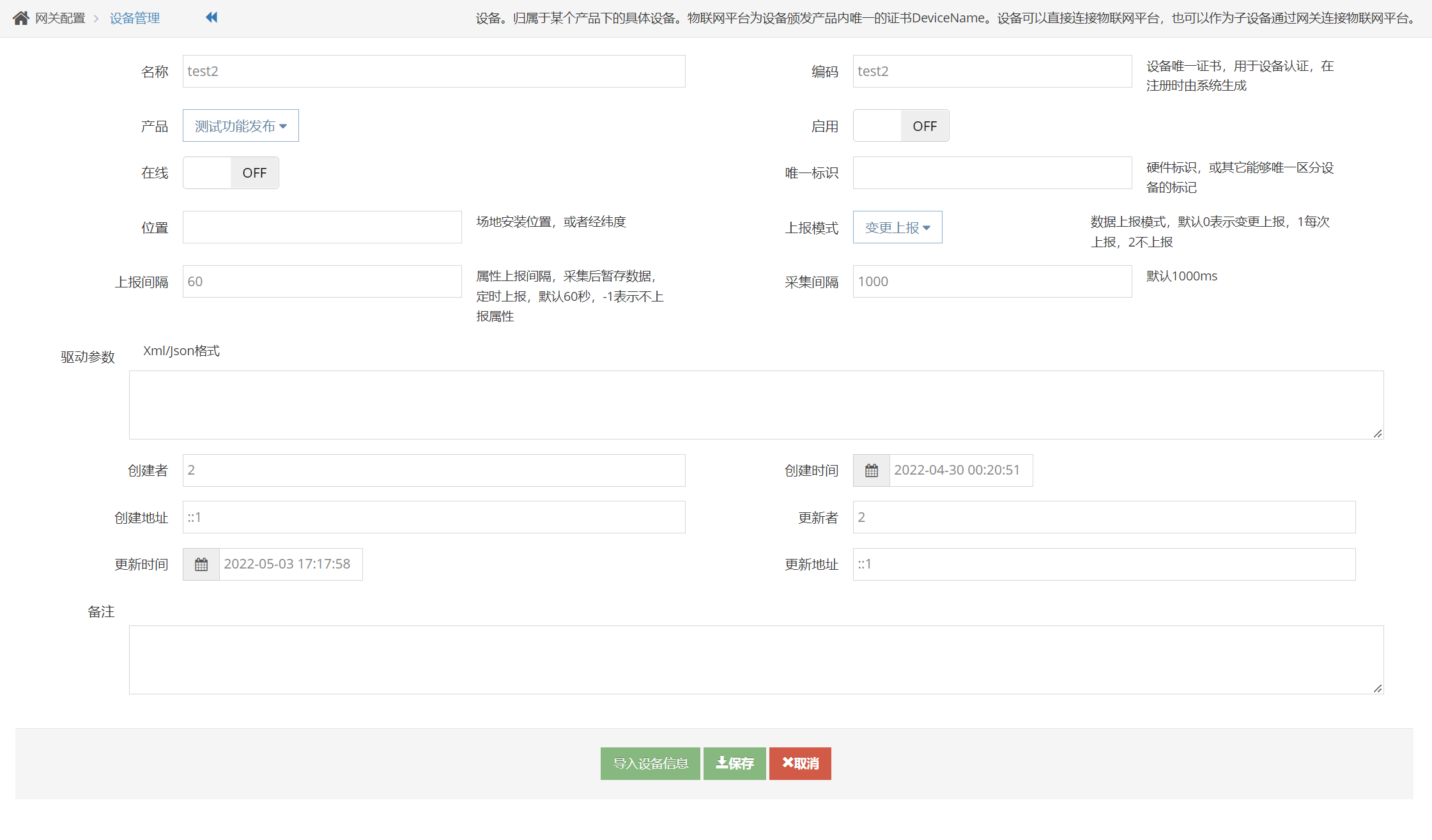 - 产品:隶属产品信息,影响想到设备驱动、物模型、数据自定义解析等信息的初始化。