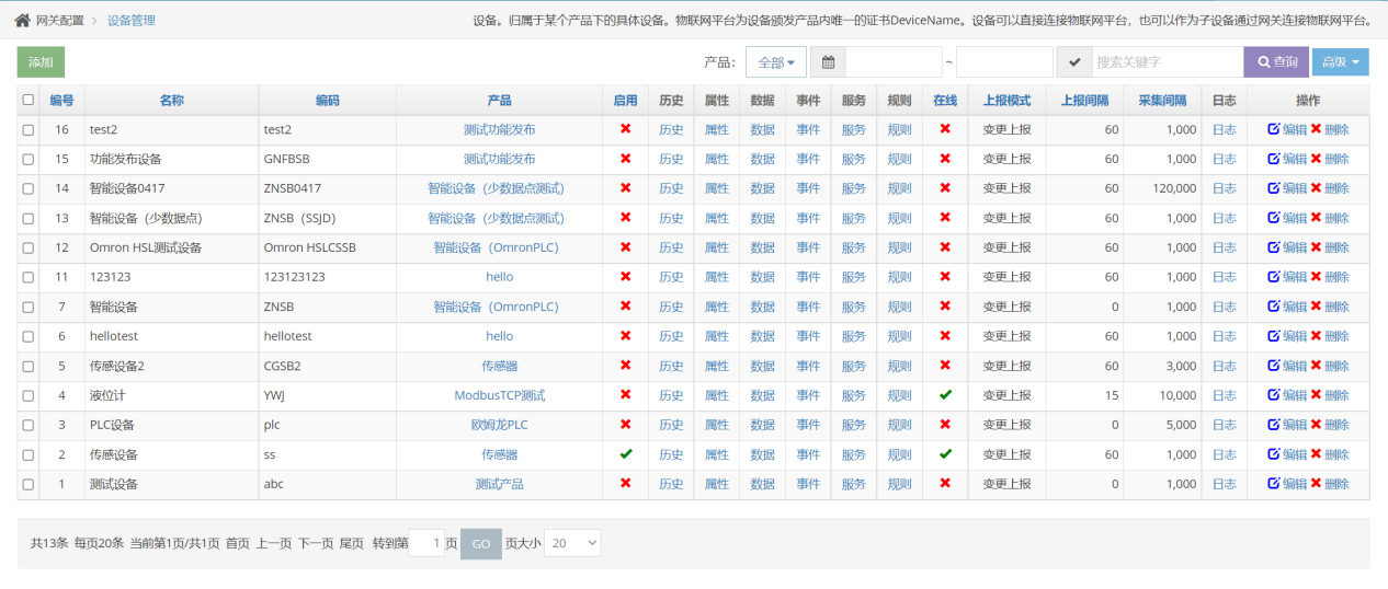 - 设备历史:设备上/下线、状态变更、设备的属性上报信息和数据上报信息的操作/变更审核日志。