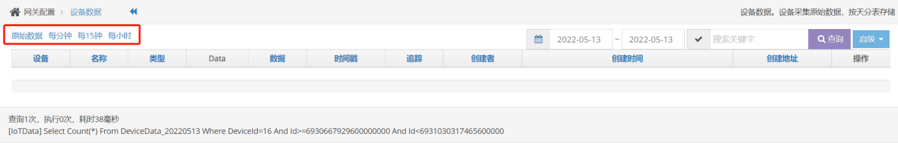 - 设备数据:记录设备采集到明细数据,进入设备列表(图33)默认是不展示相关数据,需要手工选择原始数据间隔,并进行二次查询。