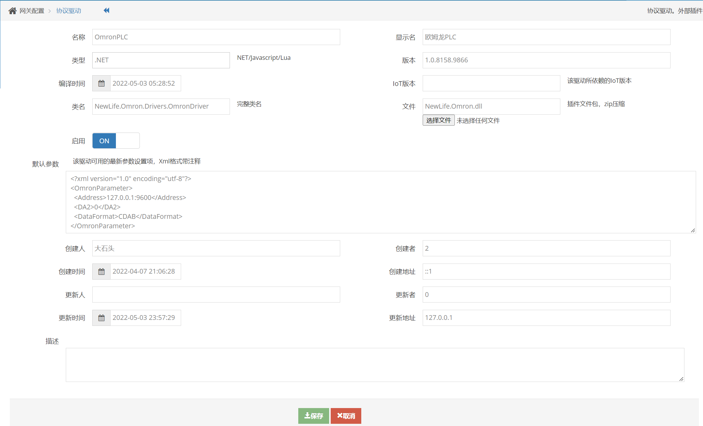 新增/编辑协议驱动页面(图36)。点击列表页左上角新增按钮、 协议驱动列表 - 编辑或双击记录行可以进入信息编辑表单页面(图37)。