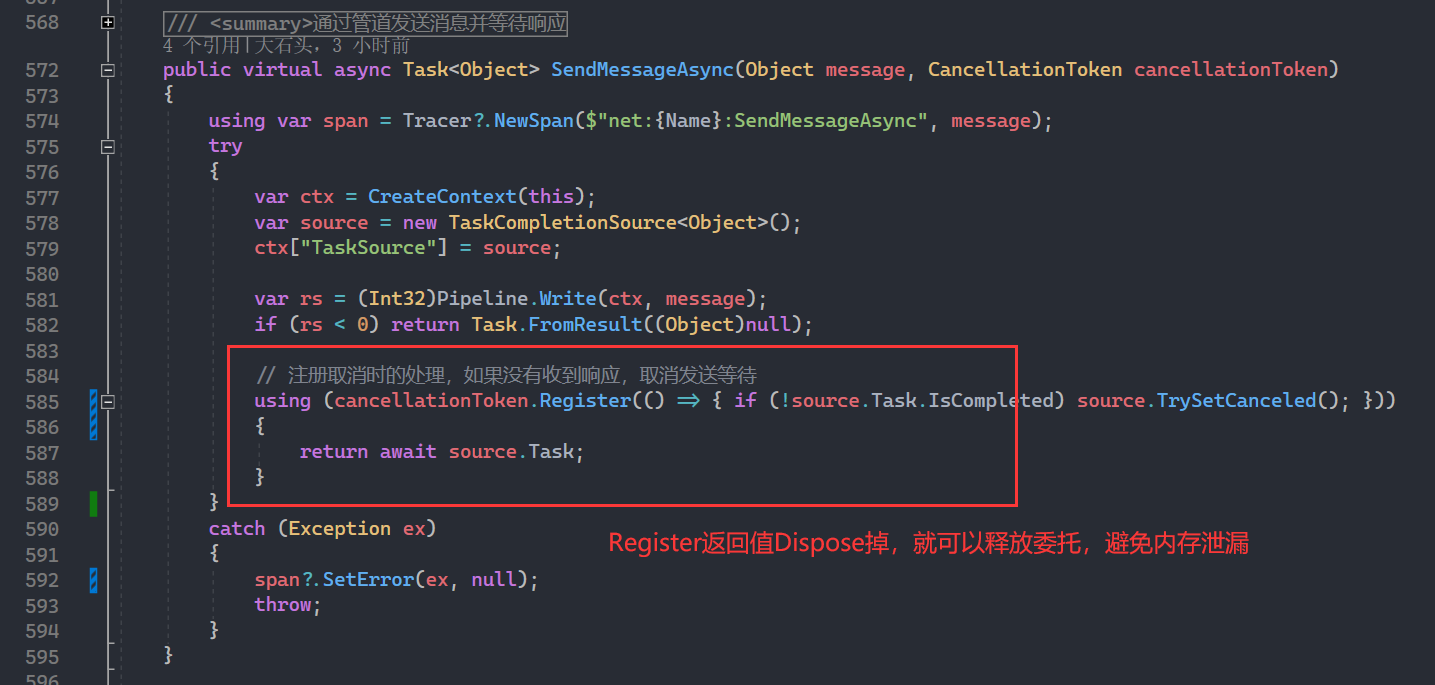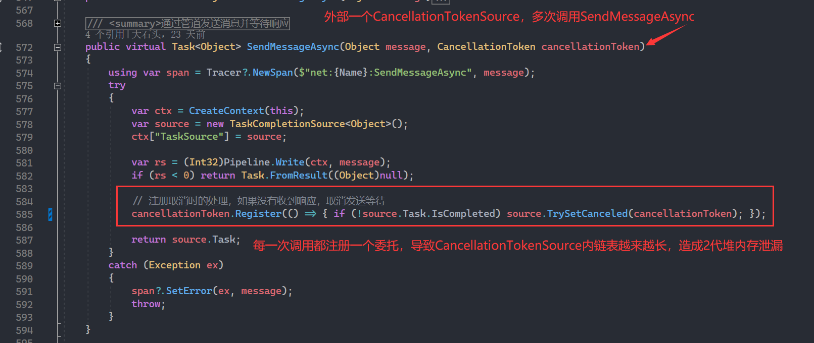 这个CancellationToken会持续注册委托函数,而委托内保持对TaskCompletionSource的引用,后者又保持了对结果集(即Byte[])的引用,导致这些对象无法释放,积压到GC2中。