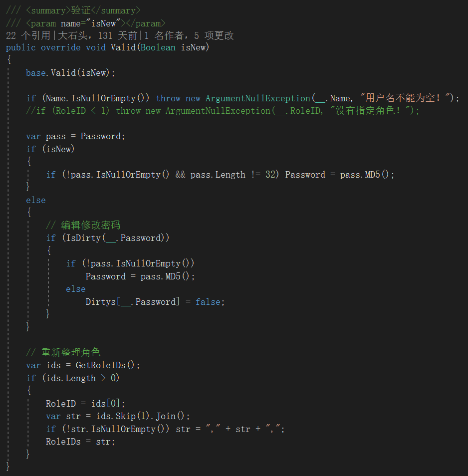 除此之外,Valid用得更多的功能是在Insert/Update之前修改完善字段数据,例如上面对密码进行MD5散列,以及格式化RoleIDs。