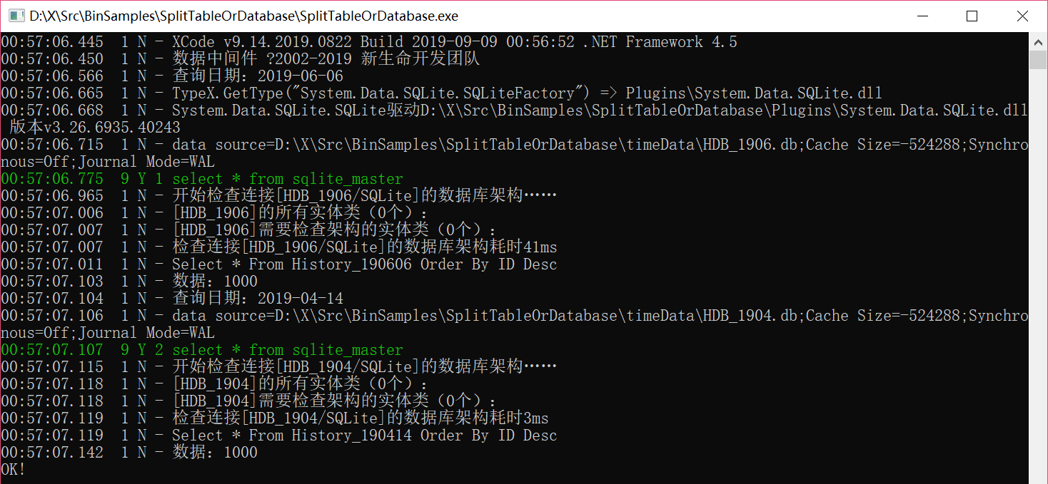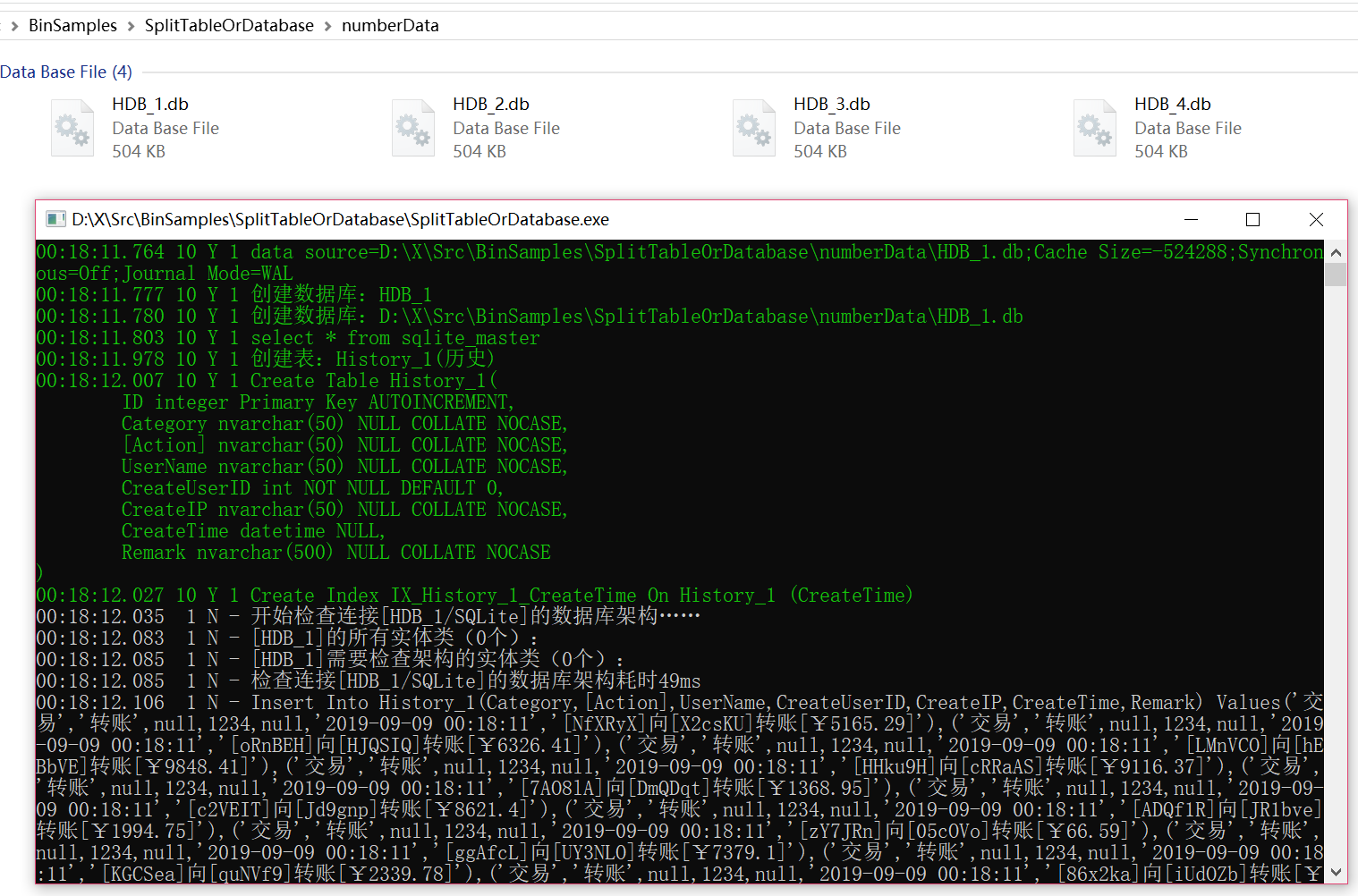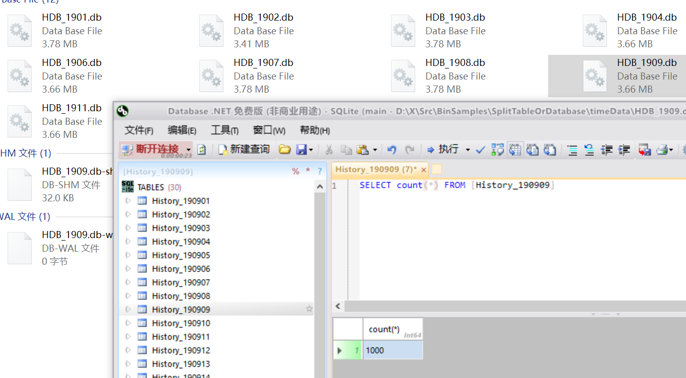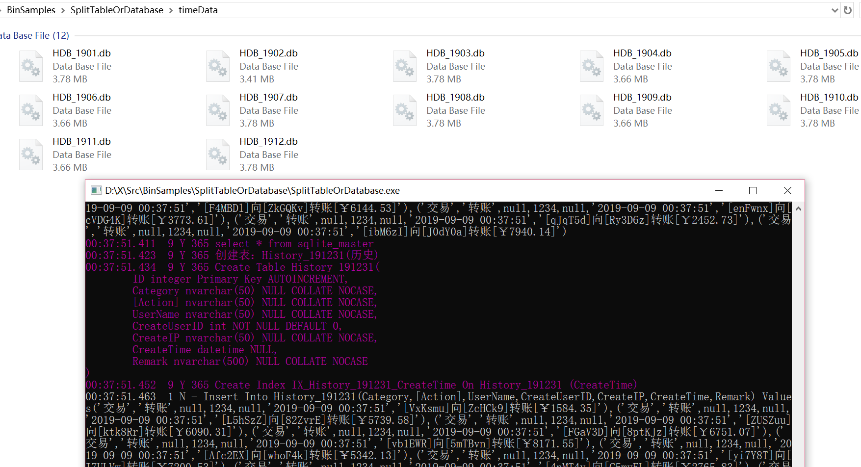 例程遍历了今年的365天,在连接字符串指定的timeData目录下,生成了12个月份数据库,然后每个库里面按月生成数据表,每张表插入1000行模拟数据。
