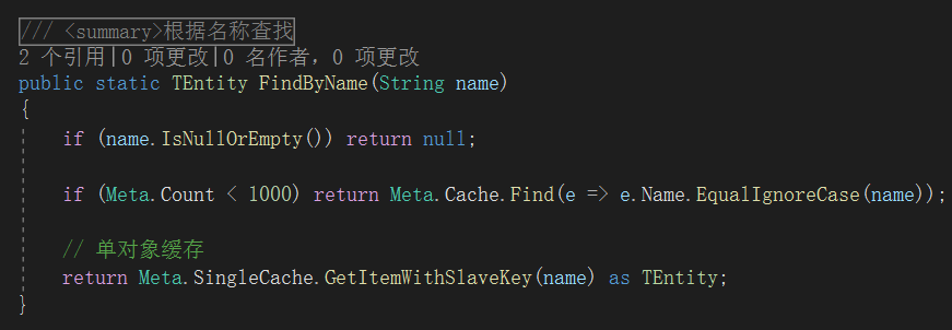 因为是 IList<TEntity>,所以适用所有Linq方法,如上面例子可以改为:Meta.Cache.Entities.FirstOrDefault(e => e.Name.EqualIgnoreCase(name))