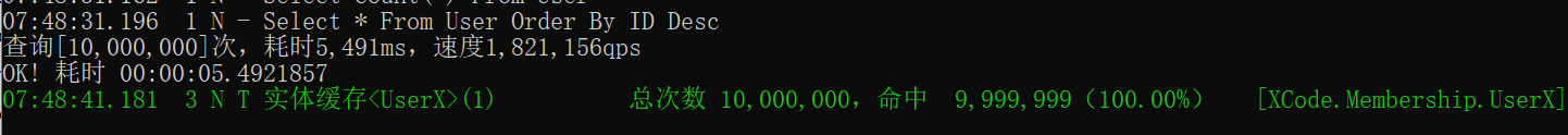 根据查询日志可以看到,虽然执行了1000万次查询,实际上只有一行select日志输出,也就是只查了一次数据库,其它9,999,999次从缓存中查找。