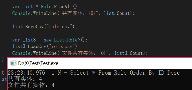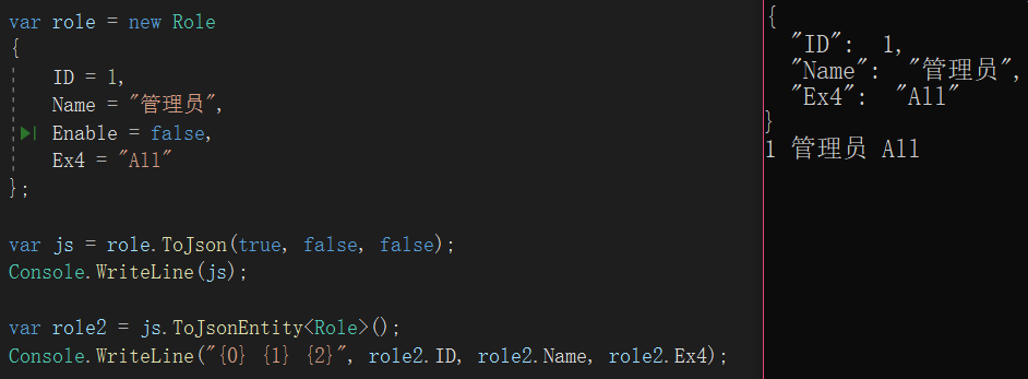 下面看看一个普通Role实体对象的Json序列化(ToJson)和Json反序列化(ToJsonEntity)的例程和效果。