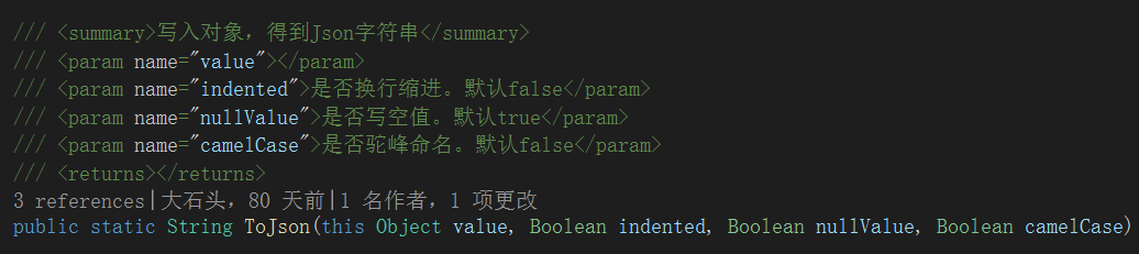 Json作为最通用的数据传输格式(没有之一),ToJson直接扩展Object,有三个参数:是否换行缩进、是否写空值、是否驼峰命名