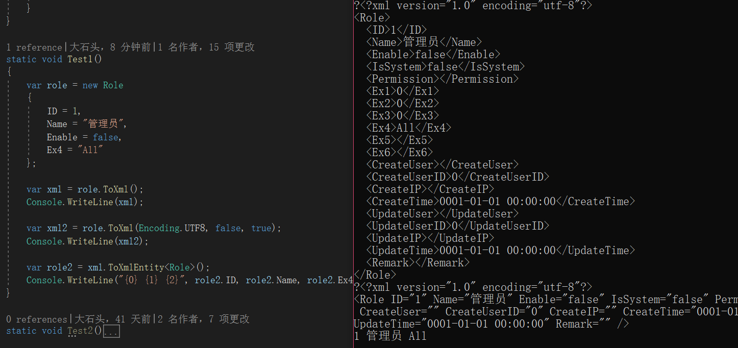 ToXml/ToXmlEntity 也是全局扩展方法,其中参数可以控制序列化为普通Xml或者Xml属性。