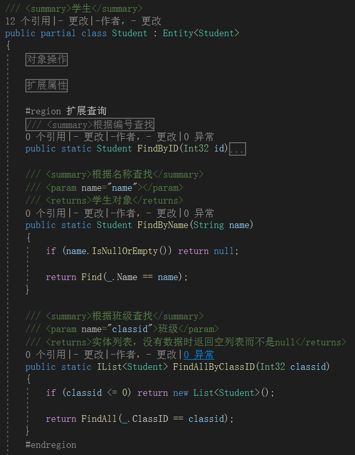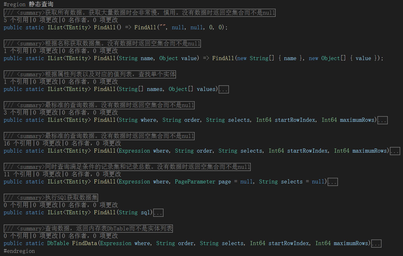 前文《实体类详解》中有讲到扩展查询,XCode生成实体类代码时,在模型类有一个region叫“扩展查询”,一般是FindByAbc/FindAllByAbc的形式。