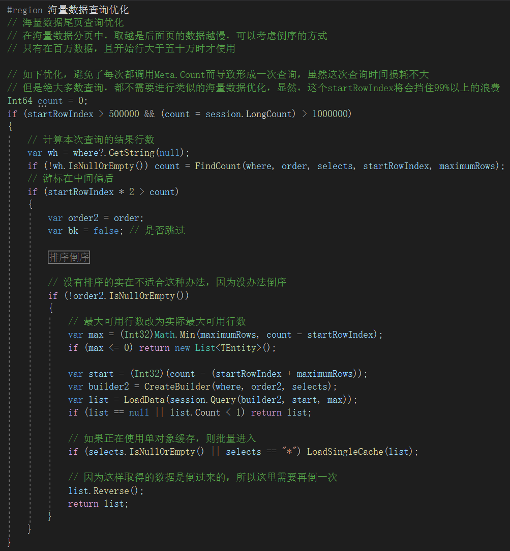 XCode采用倒置优化法,对于超过100万行(借助Meta.Count评估)的表,如果查询页超过中线,则从另一个方向查询,然后再把结果倒置回来。