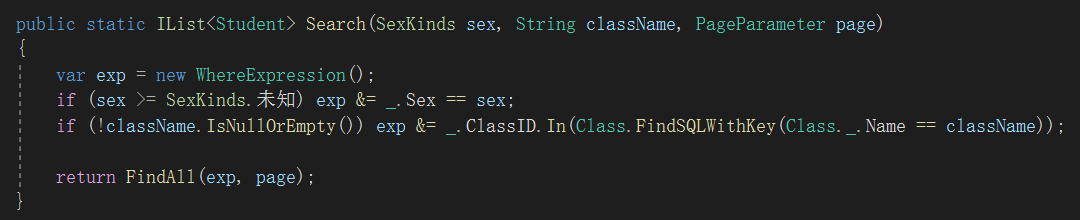 // Class.FindByName 内部用缓存 var cls = Class.FindByName("992班"); var list = Student.FindAll(Student._.ClassID==cls.ID); // select * from student where classid=1234